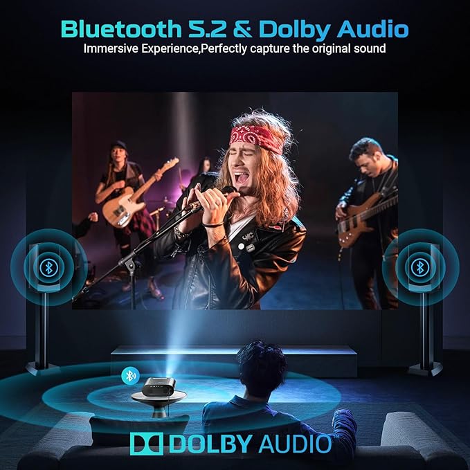 - [Dual-Band WiFi 6 & Bluetooth 5.2] This smart projector is equipped with the latest Wi-Fi 6 technology, delivering smoother, lag-free streaming for ultimate convenience and flexibility. Bluetooth 5.2 supports fast, stable two-way connections, allowing you to use your phone as a speaker or pair the projector with Bluetooth speakers and headphones. With Dolby Audio and dual 15W speakers, it creates an immersive 360Β° surround sound experience. High-fidelity sound combined with spatial audio technology brings a true cinematic atmosphere to your home.