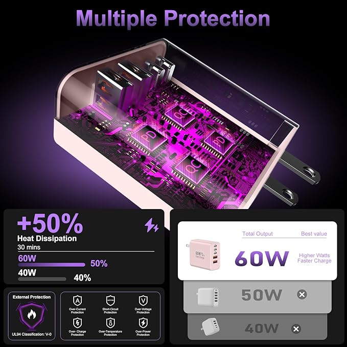 - Safety and Reliable Multiple Ports Charging Blocks: The USB C Wall Plug prioritizes safety with its comprehensive protection system, guarding against over-voltage, over-charge, and over-heating. Equipped with advanced smart chips, it intelligently adjusts the current to match your device's needs, guaranteeing a rapid and secure charging process. GaN technology makes our latest charger smaller without sacrificing a drop of power, improves charging efficiency greatly and prevent the phone from overcharging and overheating