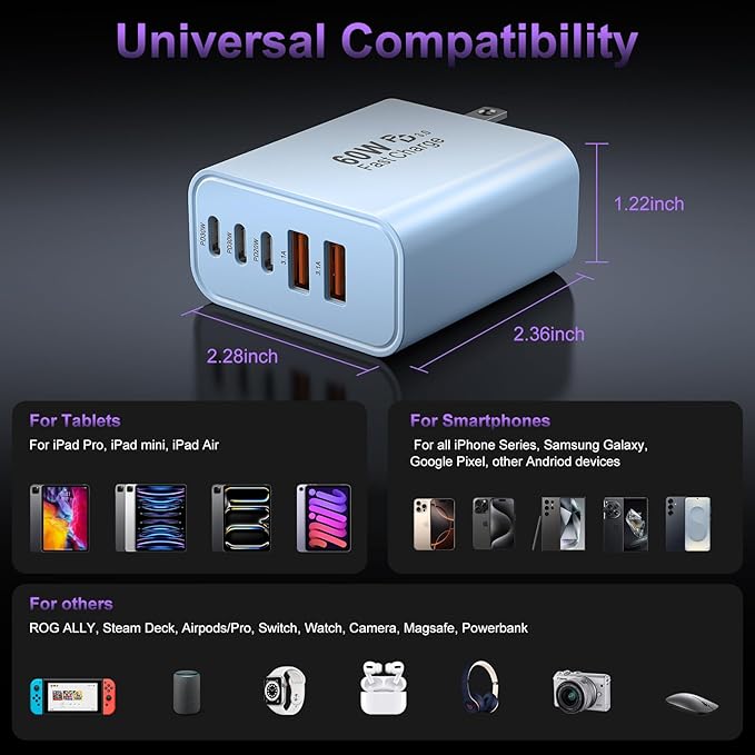 - Compact and Portable Phone Charger Brick: Designed with the pocket-friendly compact body and 5-port charging cube, the USB C box is integrated to charge multiple devices at home, office and travel. Small size saves you space and fits perfectly into pockets, handbags, travel cases. Packaged with dual 60W 5-port usb c wall chargers (cable not included). If you have any problems with the c type charger block, please contact us