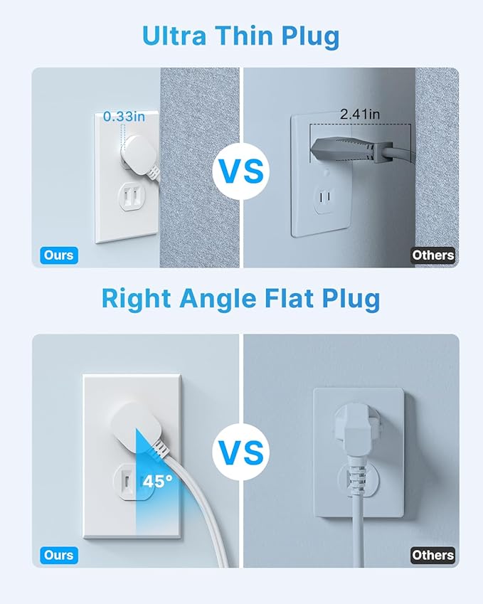 - 2 Prong Ultra Flat Plug Power Strip: With only 0.33 inch 2 prong flat wall plug head, this 2 prong to 3 prong outlet adapter can infinitely close to the wall and hide behind sofa, bed or other furniture. 45° angle design makes it more flexible, create an extra space for other plug below without blocking