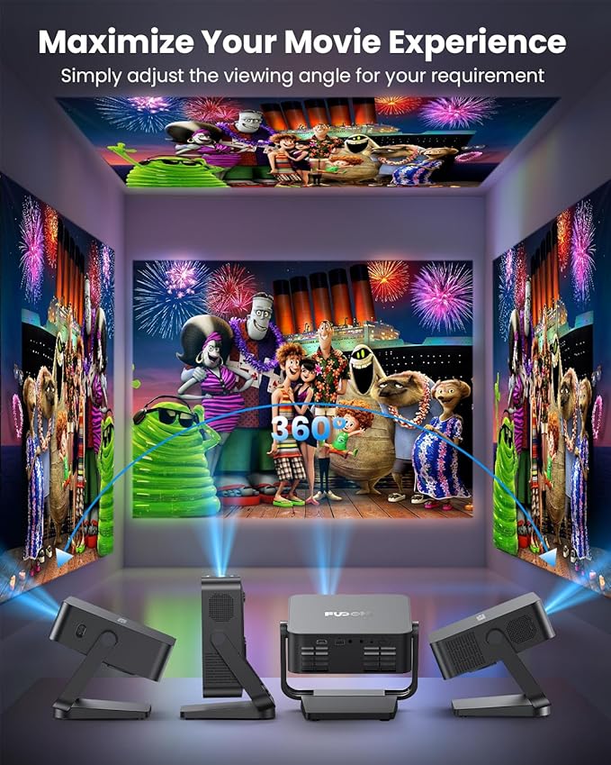 - Unique 360° Rotate and Foldable Stand: Projector features a 360° rotate supported and foldable stand for flexible wall or ceiling projection, enjoying comfortable viewing at any angle while maintaining stability. Slightly smaller and lighter than other projectors at 7.32*8.03*6.02 inches and 2.35 lbs. FUDONI projector with stand delivers a brighter and sharper image quality, making it ideal for both indoor movie nights and outdoor adventures.