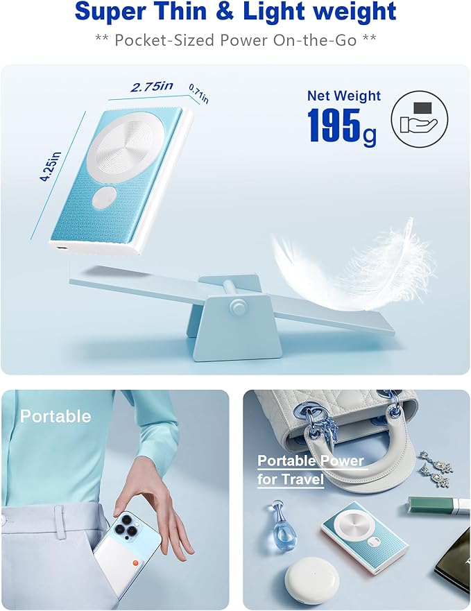- Perfect Size for On-the-Go: This power bank measures just 4.2Γ2.7Γ0.7 inches and weighs only 0.43lbsβlighter than most wallets. The ultra-slim design effortlessly fits in pockets or bags, making it the perfect charging partner for business trips, daily commutes, and travel adventures.