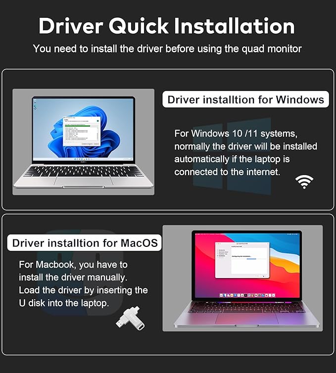 - Seamless Connectivity: With Just 1 Cable for 3 Screens, our laptop screen extender is compatible with Windows (Win10 and later) and macOS (2019 or later Macbooks including M1, M2, M3 chipsets) for laptops ranging from 13.6" to 17.3". (Please note: Not applicable to Microsoft Surface series and Chormebook). Whether you choose a USB-C or USB-A connection(Support: Thunderbolt 3/4/ USB-C/ USB-A), it's easy to connect with just 1 cable. (Please connect PD power supply when you use the quad monitor.)