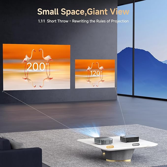 - Unveil 2025 New Era of Smart Short Throw Projectors: Say goodbye to messy cables, long throw distances, and tedious setup. The GC355 Short Throw Projector 4K ushers in the next generation of home entertainment — where big-screen immersion meets effortless convenience. Powered by the industry-leading Short Focus Pro Optical Engine and the latest intelligent platform technology, the GC355 mini projector features precision-crafted optical components from Switzerland. Every gear fits perfectly, and the light path remains perfectly stable — delivering consistent, high-fidelity performance. Introducing the true "Instant Big Screen" experience.