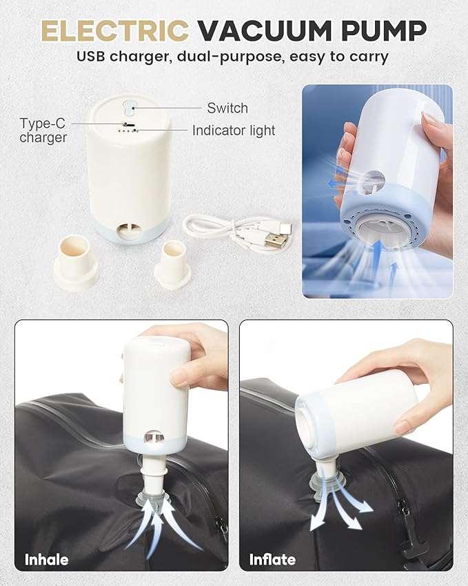 - πVACUUM PUMPS - The backpack comes with a portable vacuum pump for easy carrying on the go. It also comes with a variety of pumping port accessories, which can meet different pumping needs, whether it is to quickly compress your luggage or adjust the packing space, it can provide you with great convenience.