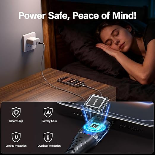 - 【Certified Safety & 10FT Length】Rest easy with our certified-safe USB-C cable, designed for worry-free daily use. Featuring an intelligent E-Maker Chip that provides Overheat Protection and Voltage Protection, it actively contributes to long-term Battery Care for your devices. This 2-pack of 10-foot cables offers extended reach, allowing you to charge comfortably on sofas, in bed, or even in the back seat of a car—Power Safe, Peace of Mind