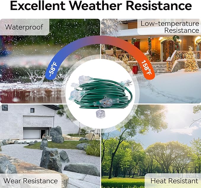 - Weather Resistance: The cords jacket are coated with PVC, which is waterproof, antifreeze, abrasion-resistant, flame-retardant and corrosion-resistant, operating temperature range of -58°F to +158°F. Can be used for outdoor Christmas decoration lights for a long time