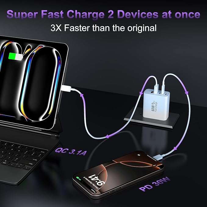 - 2-Pack 60W USB C Charger Fast Charging Blocks: Auorld 60W USB C Fast Charging Blocks support the Power Delivery and Quick Charge 3.0 fast charging functions with a total power of up to 60W. The USB-A port offers an output power of 3.1 A/5 V, while each USB-C port provides Max 30W output power, charge your Phone 16 15 Pro Max up to 65% in just 30mins, 10% faster than the original 20W USB C charger