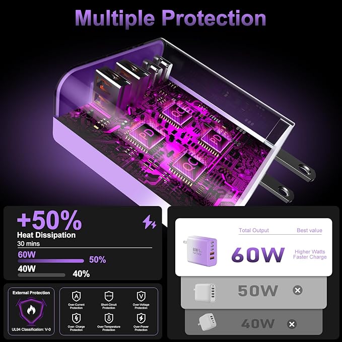 - Safety and Reliable Multiple Ports Charging Blocks: The USB C Wall Plug prioritizes safety with its comprehensive protection system, guarding against over-voltage, over-charge, and over-heating. Equipped with advanced smart chips, it intelligently adjusts the current to match your device's needs, guaranteeing a rapid and secure charging process. GaN technology makes our latest charger smaller without sacrificing a drop of power, improves charging efficiency greatly and prevent the phone from overcharging and overheating