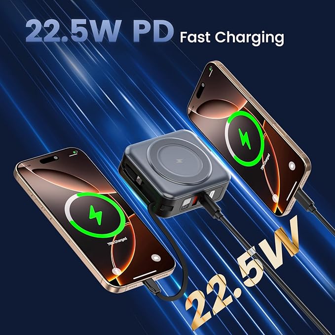 - 【15W Fast Wireless & 22.5W Wired Fast Charging】 10000mAh magnetic portable charger support 15W wireless fast charging, and 15W USB output port, 15W built-in iOS cable, 22.5W Type-C port and 22.5W built- in Type- C cable, compatible with Samsung, with iPhone, Android phone, AirPods and more devices. Perfect for Work, Travel, or Outdoor, enjoy a high-speed charging experience on the go! (Type C port and Type-C cable support input/output).