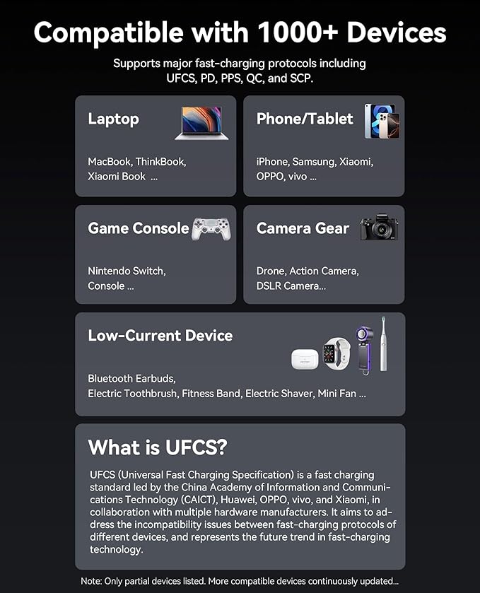 - [All-in-One Universal Fast Charging Solution] - Fast Charges Galaxy S25 Ultra 45W, iPhone 16 Pro, iPad Pro & 99.9% of Devices Under 100W, and USB-C1, USB-C2 and USB-A charge laptop, smartphone and headphones at the same time - no waiting time, no multiple chargers required with this USB C power bank ( If you use a third-party cable, please use a compatible third-party cable that supports 5A current and 100W power delivery)