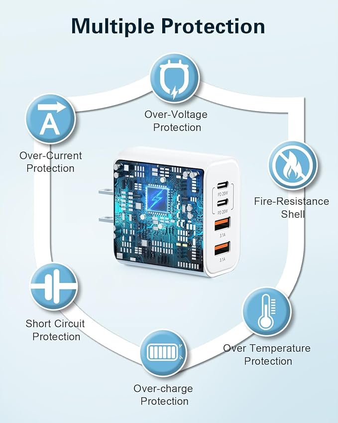 - Safety and Reliable Multiple Ports Charging Blocks: The USB C Wall Plug prioritizes safety with its comprehensive protection system, guarding against over-voltage, over-charge, and over-heating. Equipped with advanced smart chips, it intelligently adjusts the current to match your device's needs, guaranteeing a rapid and secure charging process. GaN technology makes our latest charger smaller without sacrificing a drop of power, improves charging efficiency greatly.