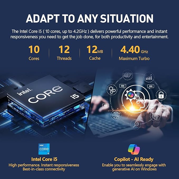 - [10 Core Intel i5-1235U Processor] Intel Core i5-1235U (Up to 4.40 GHz Max. Boost Clock, 12MB Intel Smart Cache, 10 Cores, 12 Threads). Imagine, design, and create without boundaries. The powerful 12th gen Intel Core i5 processor features machine intelligence that anticipates your needs. Discover true responsiveness with 10 cores and 12 threads for ultimate performance.