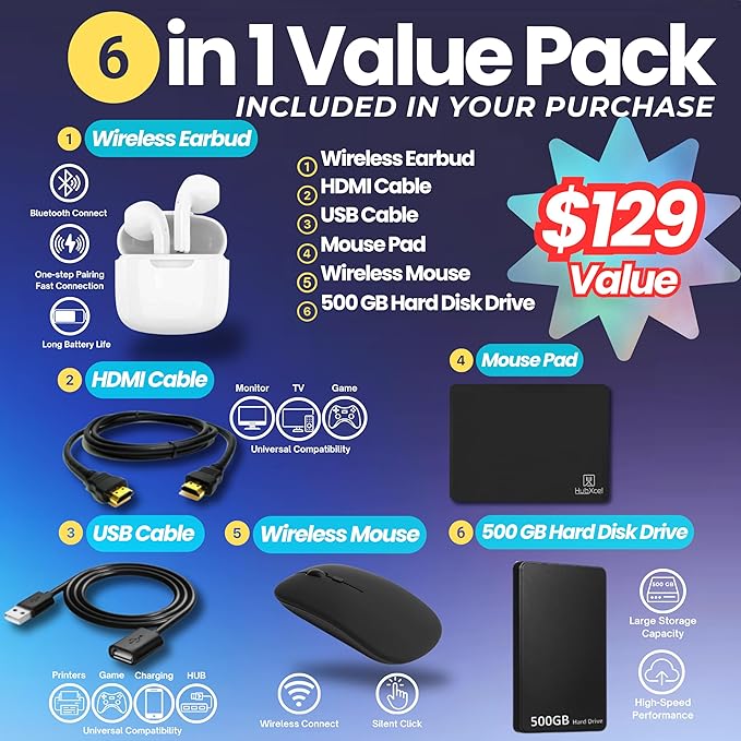 - [HubxcelAccessory with with Lifetime Micrsoft Office 2024] Value bundle includes wireless earbuds, HDMI cable, USB extension cable, mousepad, wireless mouse, and 500GB external drive. Free lifetime Microsoft Office 2024, pre-installed and activated. Ideal for Home, Student, Professionals, Small Business, School Education, and Commercial Enterprise.