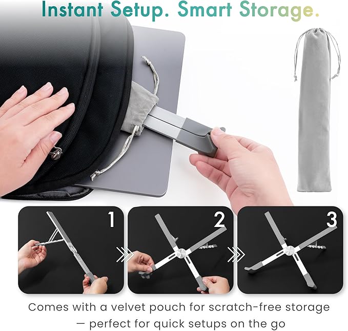 - π§³Compact & Travel-Ready Folds flat and fits into the included carry pouch. This travel laptop stand is portable, lightweight, and perfect for work anywhere.