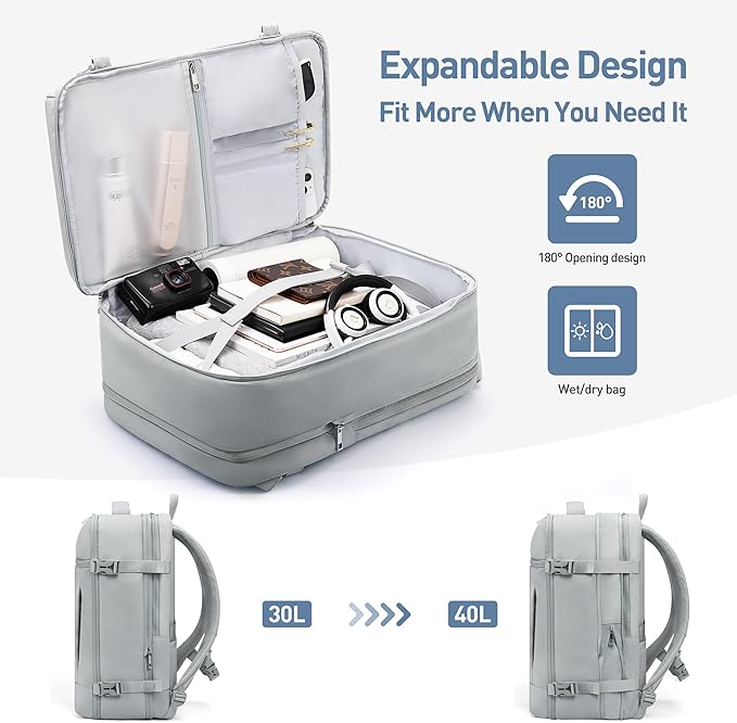 - Expandable Large Capacity Travel Backpack: Size: 18.89 x 11.8 x 7.87 inches and features an innovative expansion zipper that unlocks 40L of spacious capacity - perfect for accommodating extra travel essentials or weekend getaway gear. The ergonomically designed top handle is generously padded with 1.5cm cushioning, ensuring comfortable carrying even when fully loaded, while maintaining a streamlined silhouette that fits effortlessly under airplane seats.