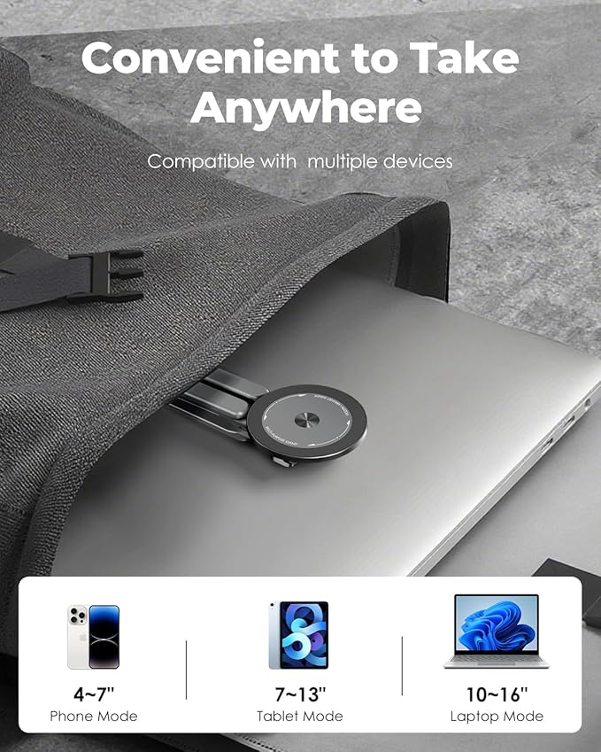 - 【3-Way Multi-Purpose Design – Portable Laptop Stand, Phone Holder & Tablet Holder】 Use it as a foldable laptop stand (compatible with 10–16 inch laptops), a desktop magnetic phone stand (fits 4–13 inch smartphones/tablets), or a hanging magnetic stand for travel on airplanes, buses, or trains. One stand solves your multi-device holding needs anywhere.