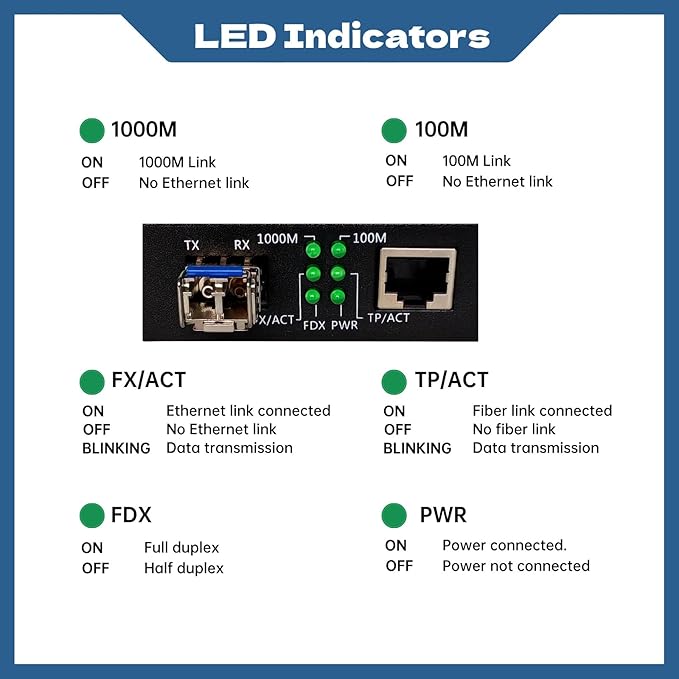 - PLUG AND PLAY: Simple installation with no configuration needed, just connect your fiber and copper cables to start transmitting data,6 LEDs Expose Real-Time Speed & Link Status.