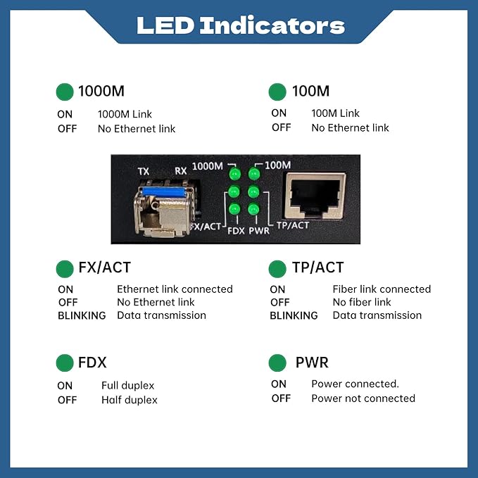 - PLUG AND PLAY: Simple installation with no configuration needed, just connect your fiber and copper cables to start transmitting data,6 LEDs Expose Real-Time Speed & Link Status.