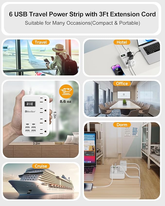 - 【Multiple Safety Protection USB Power Strip】The travel accessories flat extension cord 3ft is certified by FCC, and made of Fire-resistant PC shell, with built-in multiple security module safeguards your electronic devices from short circuit,over-voltage and over-current.Lighted on/off switch with integrated circuit breaker for overload protection of all outlets.Beeiker provides 12-month replacement and 24h service