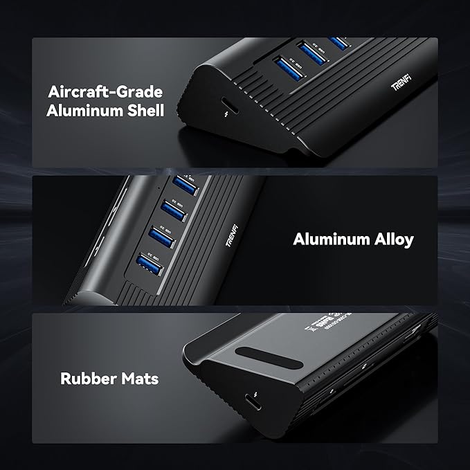 - BUILT TO LAST WITH DETACHABLE CABLE & DUAL-COOLING | Say goodbye to disposable tech. Our innovative detachable USB-C cable design means a frayed or damaged cord won’t render your hub useless—simply replace the cable, not the entire device. Engineered for peak performance, the ribbed aluminum chassis and dual-cooling system actively dissipate heat, ensuring stable, reliable connections for all your peripherals during heavy, prolonged use without throttling or overheating.