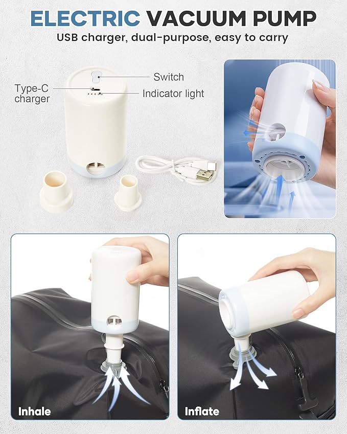 - 💎 Portable Vacuum Pump - Comes with a compact vacuum pump for on-the-go convenience. Multiple nozzle attachments allow precise air extraction, whether you're quickly compressing clothes or adjusting storage space.