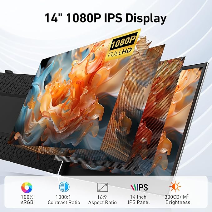 - CRISP DISPLAY & MINIMALIST DESIGN – The 14" FHD IPS display offers vibrant colors, sharp contrast, 100% sRGB and 300 nits of brightness for exceptional image clarity. Whether you’re reviewing creative content or watching a movie, this monitor for laptop ensures every detail pops. Its refined, ultra-slim look elevates any desk or café setup.