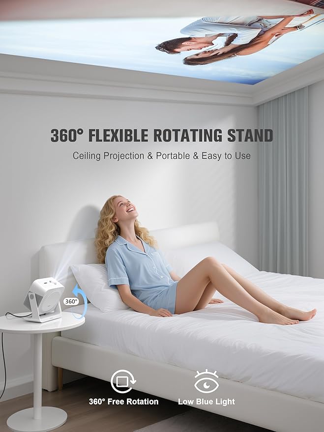 - 【2000 ANSI & 360° Portable Outdoor 4K Projector: Cinema-Quality Flexibility】 2000 ANSI delivering a vividly brighter viewing experience for you.Experience movie theater-quality visuals with stunning HDR10 clarity—deep blacks retain texture, bright scenes maintain vibrance. Supports 4K input (displays native 1080p) – ideal for backyard movie nights. Our 98% wide color coverage delivers Hollywood-grade color. The sleek portable body rotates 360° to project on ceilings or angled patio screenings, perfect for camping trips and outdoor portable movies.