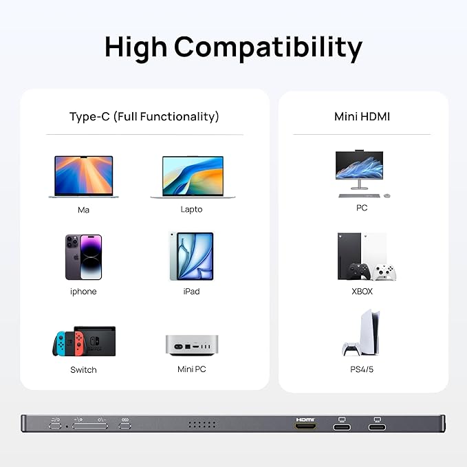 - Wide Compatibility: Enjoy hassle-free plug-and-play functionality with the portable monitor. It is compatible with various ports and devices, including laptops, PCs, Macs, phones, Xbox, PS3, PS4, PS5, and Switches. No app or driver installation required