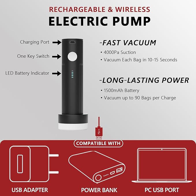 - Rechargeable & Wireless Electric Pump: Effortlessly enhance your packing and storage efficiency with our state-of-the-art wireless electric pump. Powered by a 1500mAh battery, it allows up to 90 vacuum sealing per charge. With 4000Pa suction, it can compress a bag in 10-15 seconds.