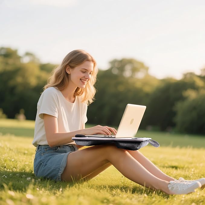 - 【Ergonomic Comfort Design】Our lap desk for bed features soft memory foam wrist rests to alleviate hand strain from prolonged typing, providing gentle support while creating a natural anti-slip barrier to prevent the laptop from sliding. The backrest cushion is filled with high-density EPS foam particles, perfectly contouring to the curve of the thighs to effectively distribute pressure and enhance comfort during home office use.
