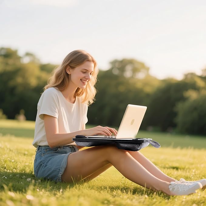 - 【Ergonomic Comfort Design】Our lap desk for bed features soft memory foam wrist rests to alleviate hand strain from prolonged typing, providing gentle support while creating a natural anti-slip barrier to prevent the laptop from sliding. The backrest cushion is filled with high-density EPS foam particles, perfectly contouring to the curve of the thighs to effectively distribute pressure and enhance comfort during home office use.