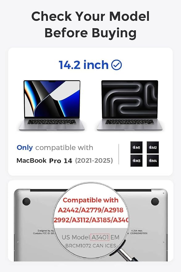 - Compatible Phone Models : MacBook Pro 14 Inch Year (2021-2025, M1, M2, M3, M4, Pro, Max) (Model: A2442,A2779, A2918, A2992, A3112, A3185, A3401) MacBook Pro 14 Inch Year (2021-2025, M1, M2, M3, M4, Pro, Max) (Model: A2442,A2779, A2918, A2992, A3112, A3185, A3401)