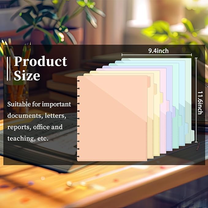 - Durable & functional divider set: Our 9x11 inch divider set includes 8 high-quality plastic dividers, great for organizing documents in your binder. Designed to fit 8.5x11 inch paper, these dividers offer both durability and convenience with their built-in pockets. Keep your papers, notes, or recipes organized without the need to punch holes.