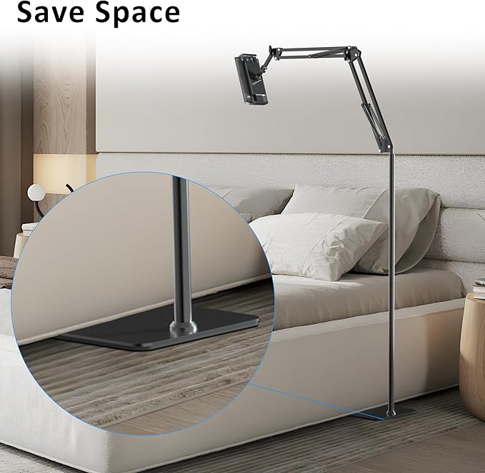 - 【 Movable & Save Space 】Compared with other clamp style, floor stand design can be movable, then you can read in bed/sofa/bathroom etc. The stand no need tools for installation, it is a flat base, you can put the base under the bed or sofa which save much space for your reading, watch phone/tablet tiktok video, live stream, video recording