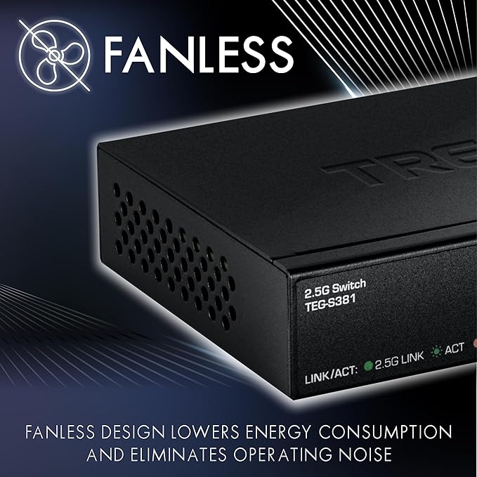- FANLESS: The fanless design of the 2.5G switch lowers energy consumption costs and eliminates operating noise.