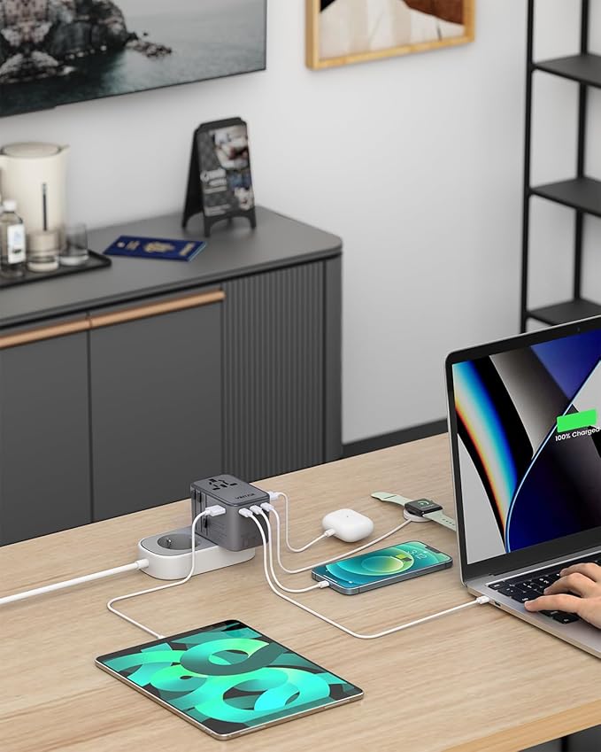- 6-in-1 Universal Power Adapter: This international plug adapter comes with 1 universal AC, 3 USB-C PD and 2 USB-A QC. It has a maximum power of 1100W at 110Vac and 2300W at 230Vac, which can charge up to six devices at the same time. It provides a super-fast charging experience for worldwide travel