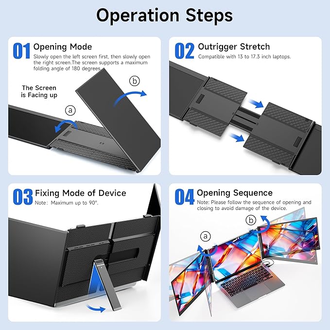 - [Triple screen, Triple efficiency] The portable monitor is the perfect triple screen monitor for laptop, allowing you to open multiple windows simultaneously without switching back and forth continuously on a single laptop screen, improving your efficiency by up to 300%. With this monitor extender for laptop, you can easily build your own working station anywhere. Very suitable for conference presentations and multitasking. Perfect for gamers, programmers, finance and investment professionals, designers, and anyone who needs more efficient workflows.