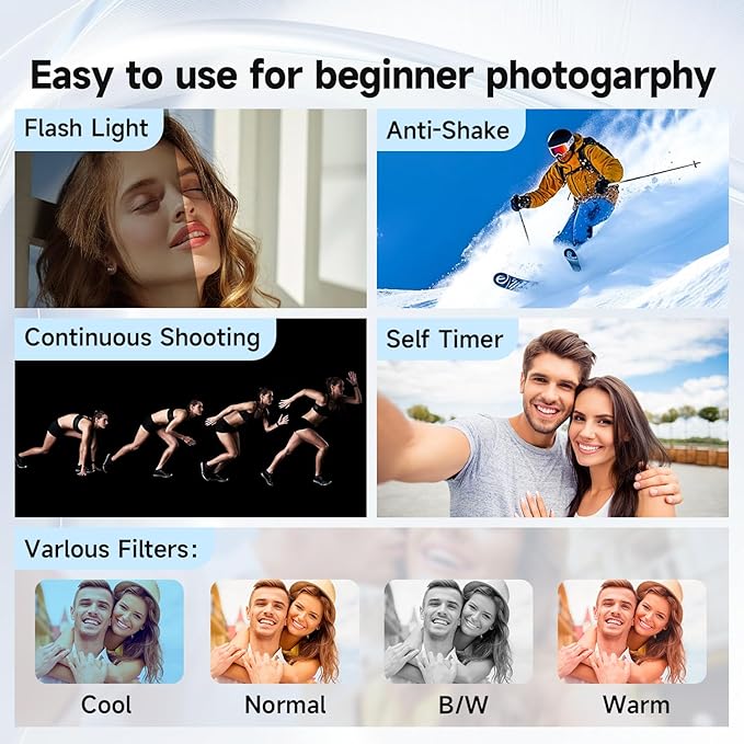 - 【Advanced Features & Bright Flash】The camera digital elevates your photography with anti-shake, time-lapse, slow-motion, face detection, continuous shooting, and vintage filters. Customize your shots with ISO, exposure compensation, timestamp, self-timer, and delayed shooting. Camera with built-in flash enhances low-light scenes, reducing noise and improving clarity in nighttime portraits, and dim environments, ensuring every shot remains bright and detailed.