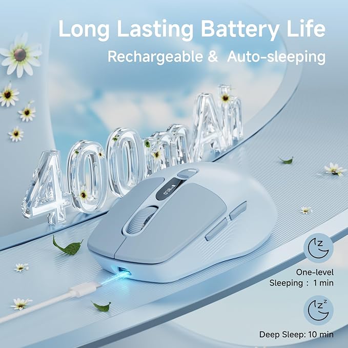 - 【Ergonomic Design & Auto Sleep Mode】: Weighing only 65g, the Blue mouse is designed with an ergonomic shape that fits naturally in your hand, reducing wrist strain during extended use (Which is very suited for SMALL to MEDIUM-sized hands). Equipped with intelligent power-saving technology, this computer mouse automatically switches to a low-power state after 1 minute of idling and a full sleep mode after 10 minutes. Simply double-click to wake it from any mode