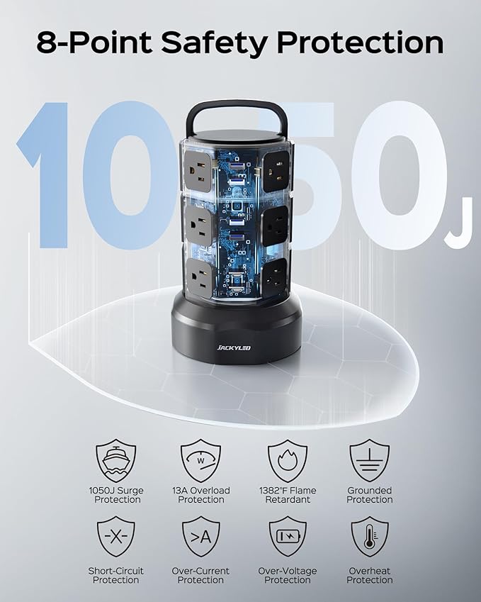 - ▶【2 USB-C & 4 USB-A Charging Ports】Tired of searching for adapters when the phone battery is low? With 2 USB-C ports and 4 USB-A ports, JACKYLED USB power strip tower is here to simplify your charging needs. The inbuilt smart charging technology empowers the USBs to intelligently detect your electronic devices and charge them at optimal yet safe speeds—compatible with most USB devices. (Total Output: 4.8A/24W Shared, USB-C: 5V⎓3A, USB-A: 5V⎓2.4A)
