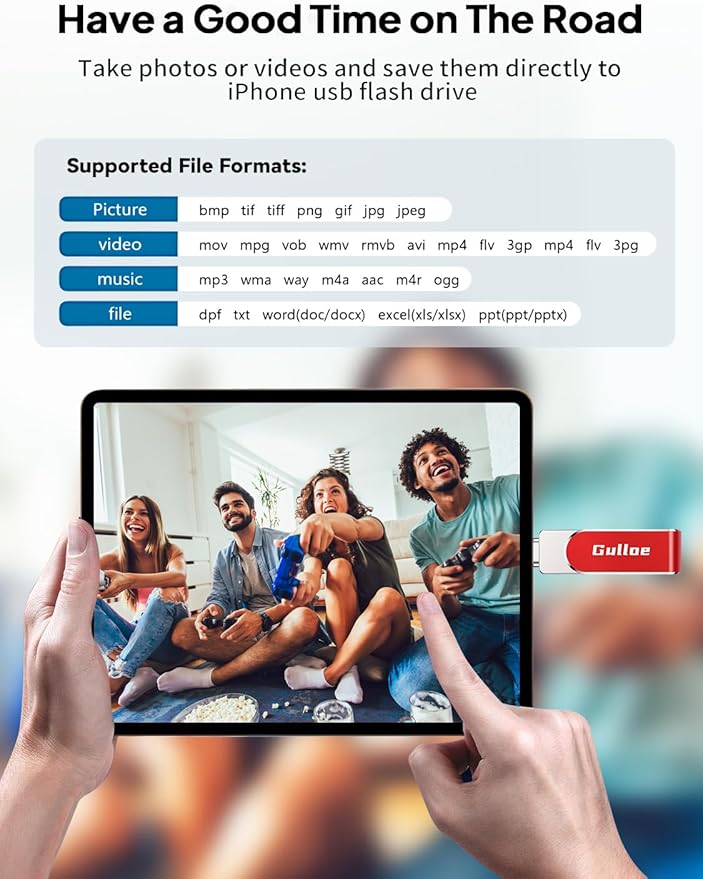 - 【Watch Movies, Photos and Play Music Directly From Phone Flash Drive】Store your favorite videos, audios and music on your iPhone's Photo Stick, then seamlessly plug and play on your iPhone or iPad anytime, anywhere. No more need for Internet or WiFi. This iPhone storage device plays videos in many different formats. Pictures stored on the Phone storage device also support different formats. Great way to store all your pictures and videos on an phone external storage device.