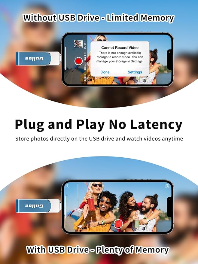- 【Watch Movies, Photos and Play Music Directly From Phone Flash Drive】Store your favorite videos, audios and music on your iPhone's Photo Stick, then seamlessly plug and play on your iPhone or iPad anytime, anywhere. No more need for Internet or WiFi. This iPhone storage device plays videos in many different formats. Pictures stored on the Phone storage device also support different formats. Great way to store all your pictures and videos on an phone external storage device.