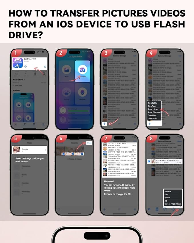 - Convenient and User-Friendly: This MFi-certified 256GB iPhone flash drive allows you to easily backup your phone photos, videos, and phonebook with just one click using the app on the pen drive. You can also backup files to your computer using the USB port, providing double protection. (Note: To use this jump drive on an iPhone/iPad, please go to the App Store to download and install the "LuxSync PRO" app. For Android phones, simply enable the OTG function, no need to download additional apps.)