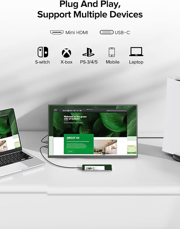 - 【Plug & Play, Strong Compatibility】: Portable laptop monitor just connects device with corresponding cable, be turned on and used in seconds. Laptop monitor is equipped with full-function mainstream interfaces such as USB-C and HDMI, and can be seamlessly adapted to laptops (Windows/macOS systems), smart phones (Android /iOS), tablets, and game consoles (Swit-ch/PS-4/5/X-box, Steam-deck)