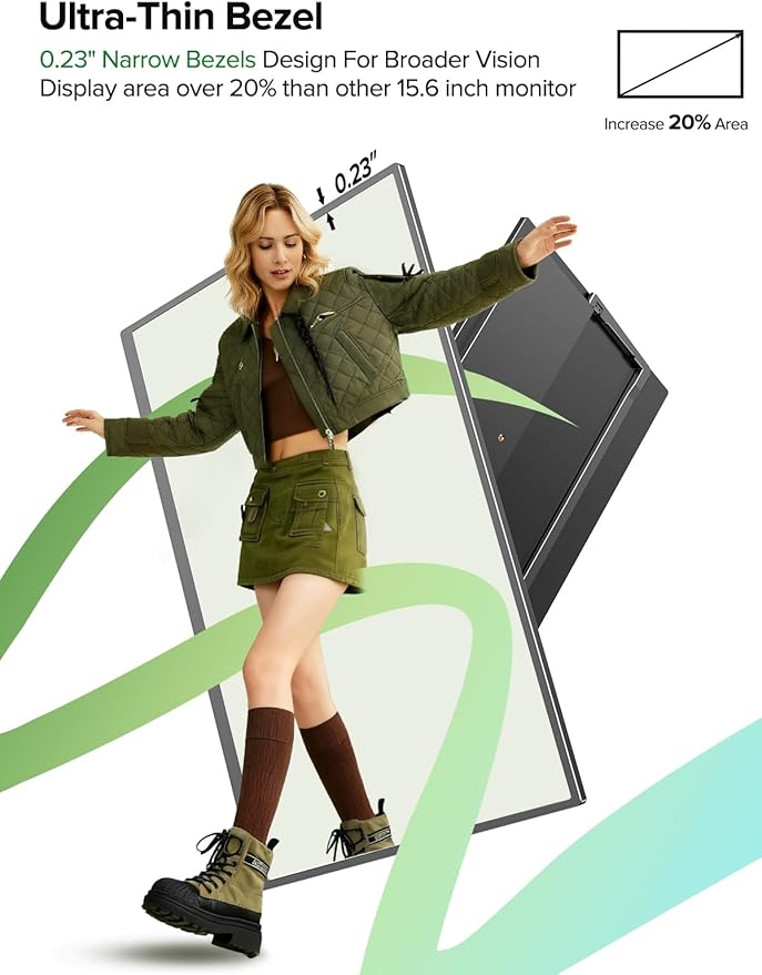 - 【Narrow Bezels+16:9 Golden Ratio】: Portable computer monitor adopts ultra-narrow bezel design, significantly reducing redundant space at the edge of the screen, making the body visually more delicate and thin. It is equipped with 16:9 golden screen ratio at the same time,strikes a balance between office efficiency and entertainment experience, making every inch of the screen fully utilized.