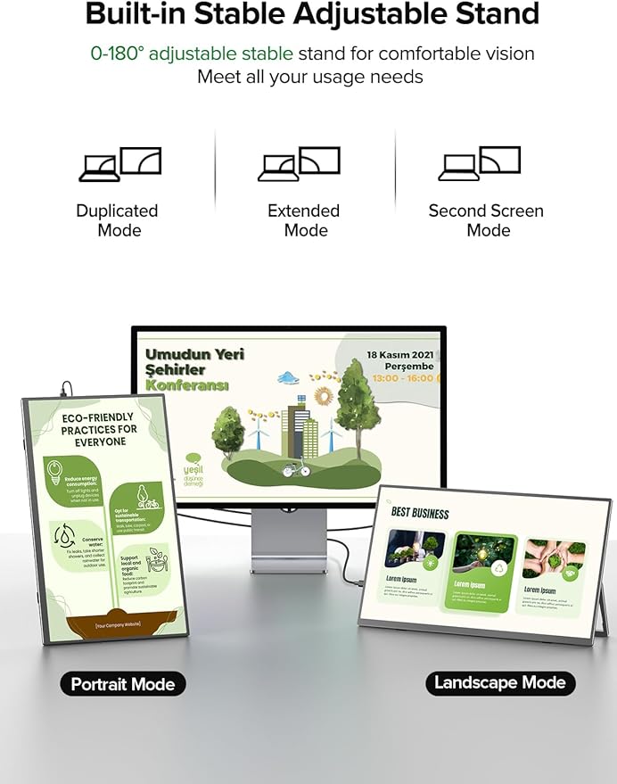 - 【Flexible Stand/VESA Design】: Portable screen for laptop is built-in foldable and 0~180° adjustable stand, allowing you to easily find a comfortable viewing Angle on various planes and stably support both horizontal and vertical placement.VESA standard wall-mounted design, unlocking new and diverse placement postures. Meet your personalized demands for an efficient and comfortable user experience.