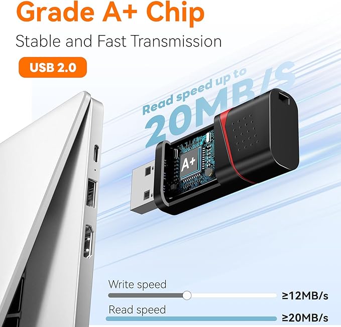 - STABLE & FAST TRANSMISSION: The 2GB USB 2.0 memory stick adopts Grade A+ chips, read speed of 12-20 MB/s and a write speed of 6-12MB/s. Resisting temperature changes and X-ray, protect your data and preventing data loss