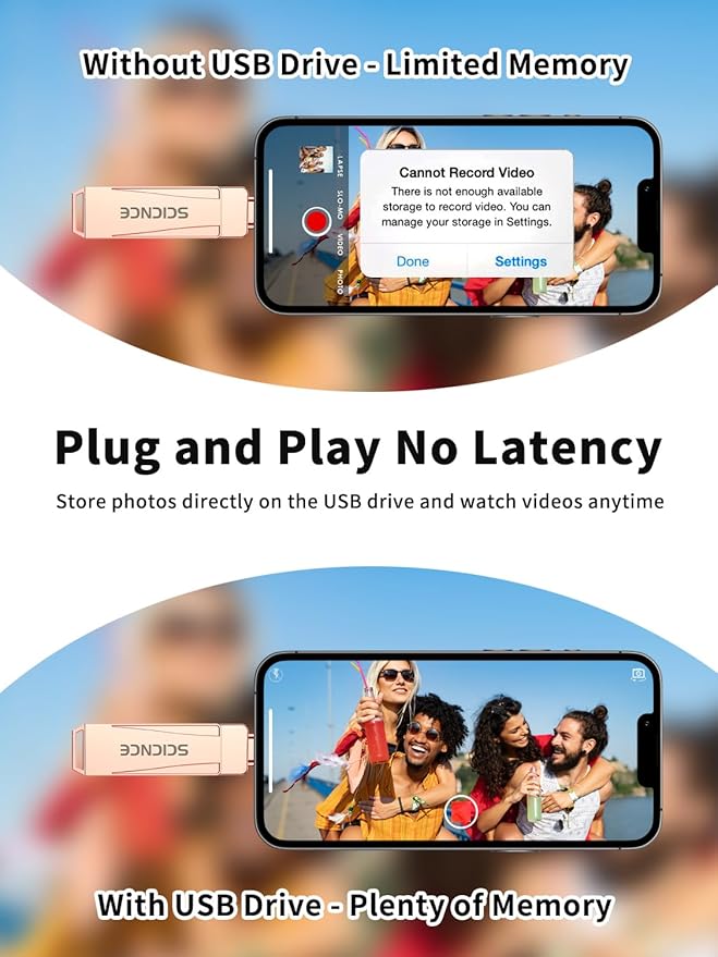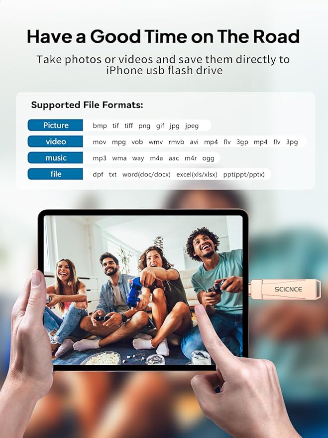 - 【Watch Movies, Photos and Play Music Directly From Phone Flash Drive】Store your favorite videos, audios and music on your iPhone's Photo Stick, then seamlessly plug and play on your iPhone or iPad anytime, anywhere. No more need for Internet or WiFi. This iPhone storage device plays videos in many different formats. Pictures stored on the Phone storage device also support different formats. Great way to store all your pictures and videos on an phone external storage device.