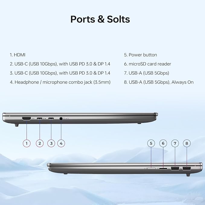 - Enhanced Connectivity and Versatility: 1x USB-A (USB 5Gbps / USB 3.2 Gen 1), 1x USB-A (USB 5Gbps / USB 3.2 Gen 1), Always On, 2x USB-C (USB 5Gbps / USB 3.2 Gen 1), with USB PD 3.0 and DisplayPort 1.4, 1x HDMI 1.4b, 1x Headphone / microphone combo jack (3.5mm), 1x microSD card reader, Wi-Fi 6, Bluetooth, Backlit Keyboard, Webcam